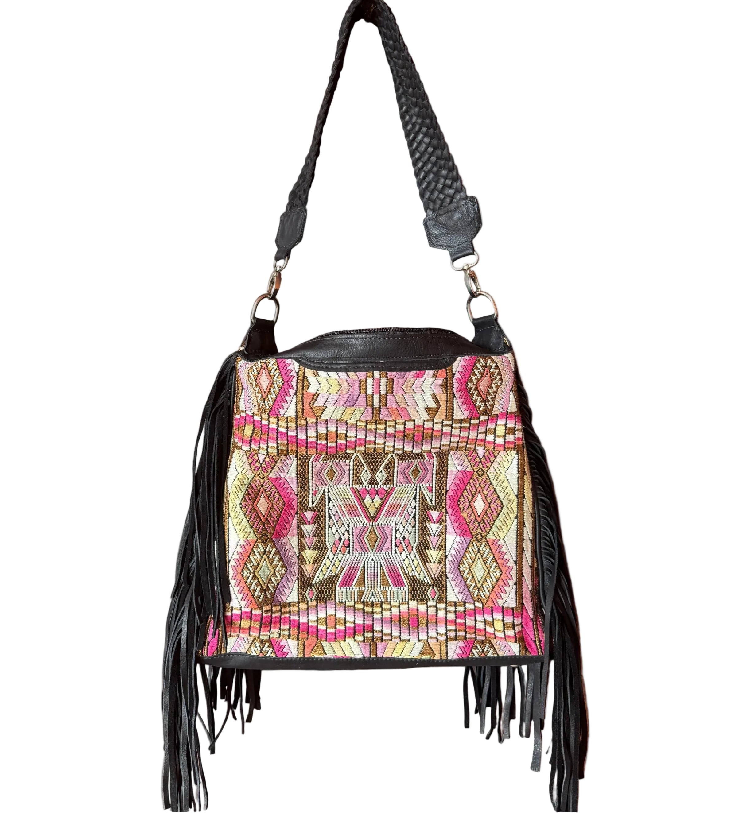 This one-of-a-kind fringe hobo shoulder bag is handcrafted in Guatemala by skilled artisans, blending bold, traditional huipil textiles with smooth leather detailing and dramatic hand-cut leather fringe. Each huipil panel is vintage and upcycled, making every bag completely unique.