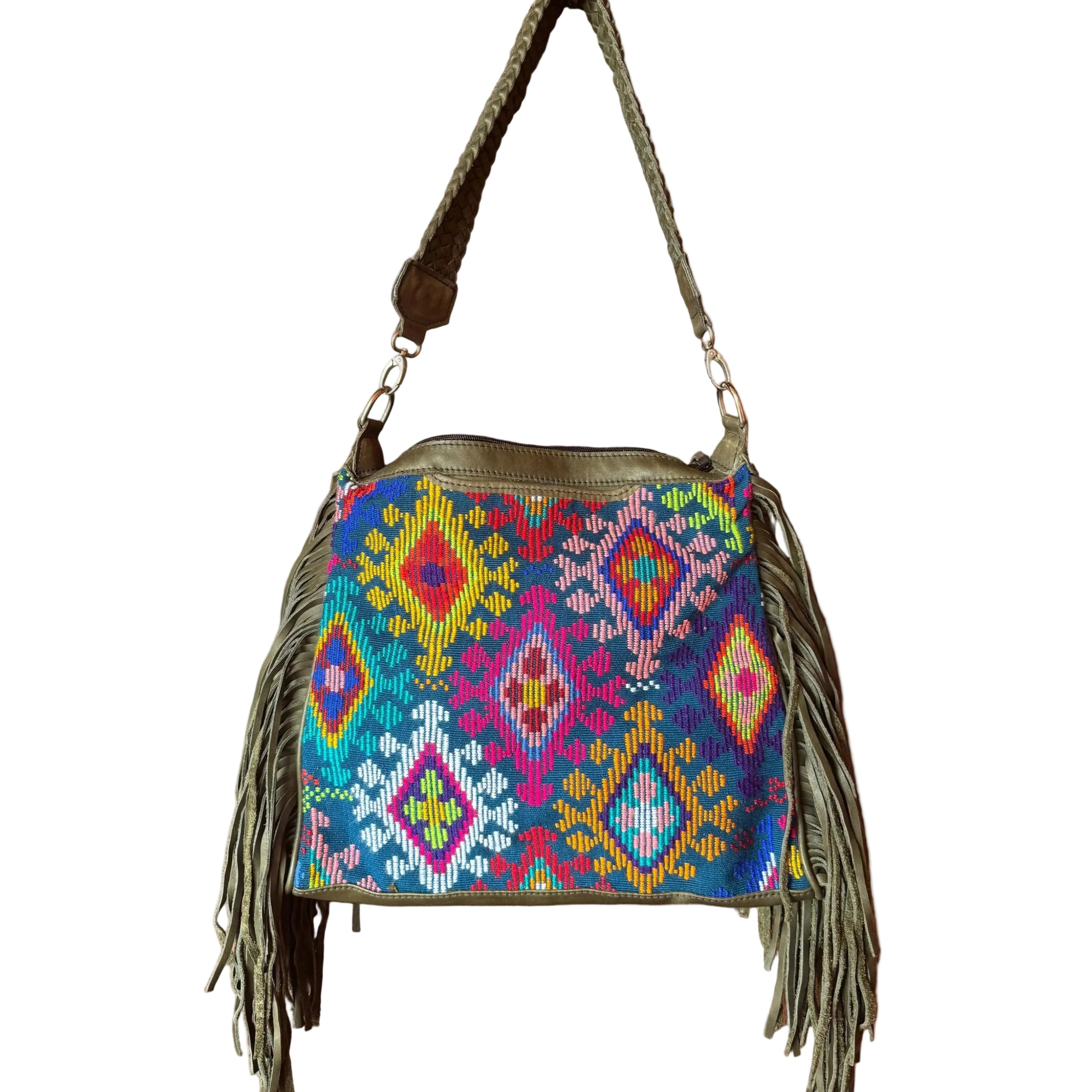 This one-of-a-kind fringe hobo shoulder bag is handcrafted in Guatemala by skilled artisans, blending bold, traditional huipil textiles with smooth leather detailing and dramatic hand-cut leather fringe. Each huipil panel is vintage and upcycled, making every bag completely unique.