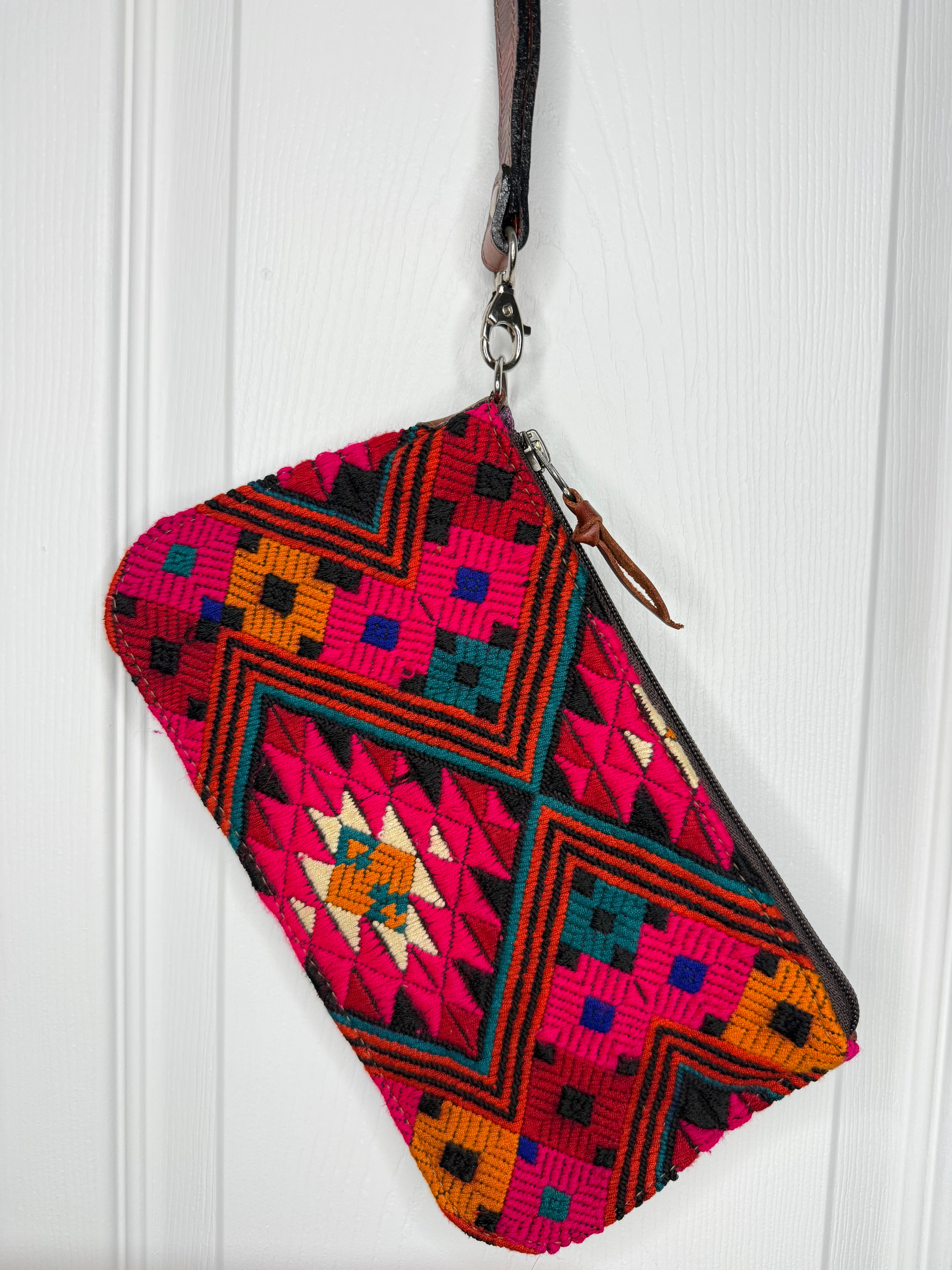 This one-of-a-kind flat zip wristlet clutch is handcrafted in Guatemala by skilled artisans, showcasing authentic upcycled huipil textiles paired with a smooth leather backing for durability and everyday ease. Each huipil is vintage and traditionally woven, making every clutch completely unique.