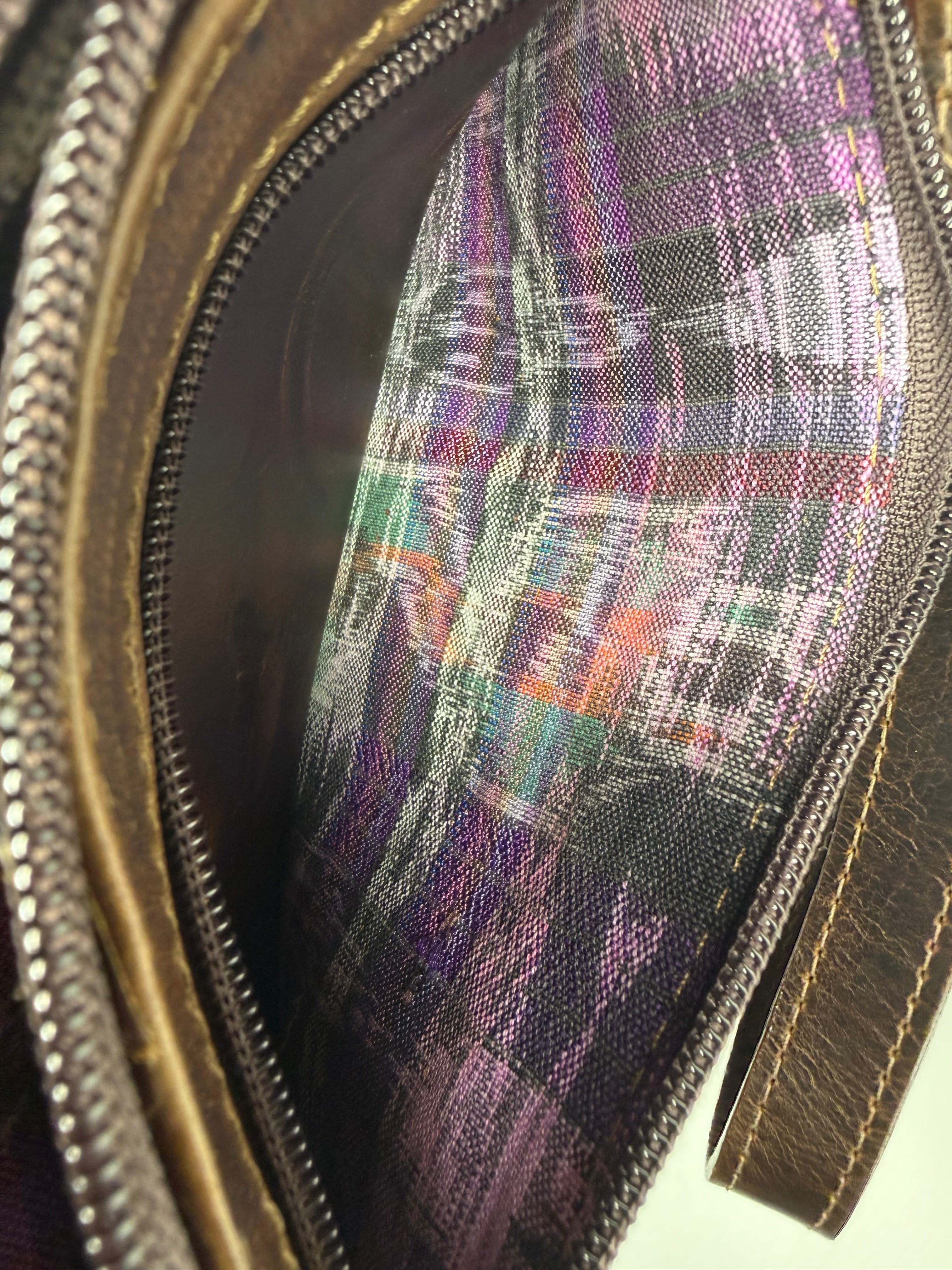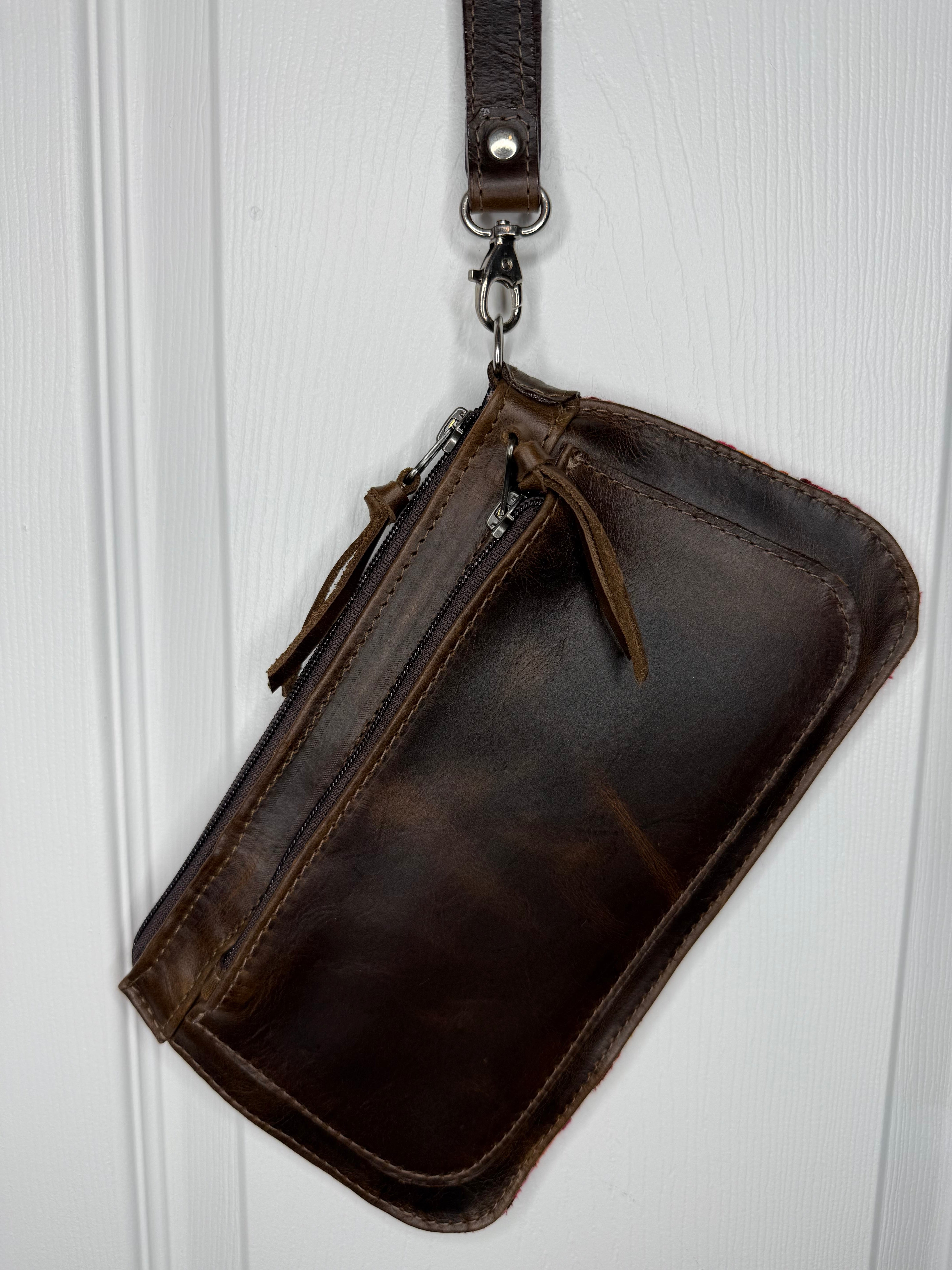 This one-of-a-kind flat zip wristlet clutch is handcrafted in Guatemala by skilled artisans, showcasing authentic upcycled huipil textiles paired with a smooth leather backing for durability and everyday ease. Each huipil is vintage and traditionally woven, making every clutch completely unique.