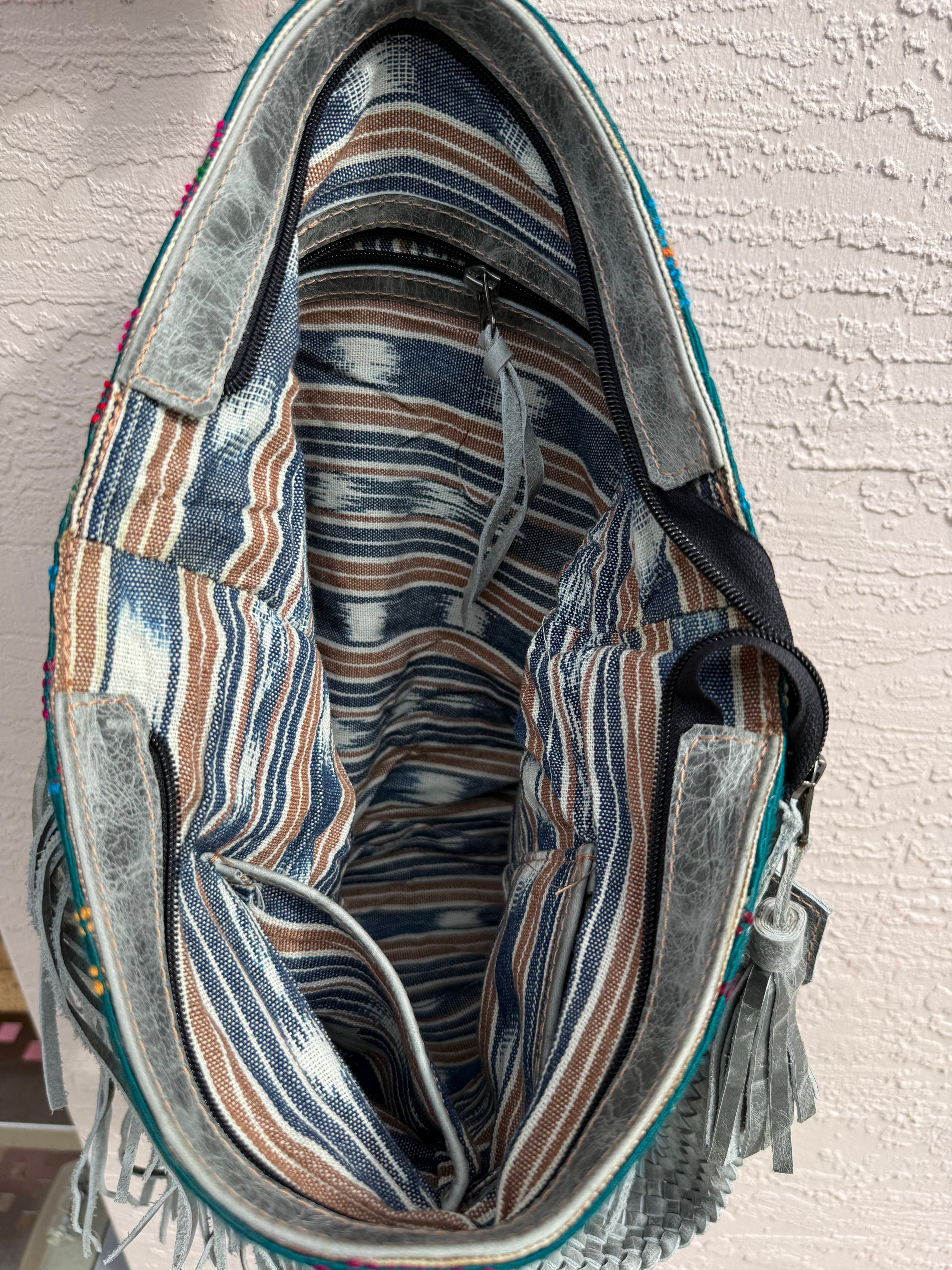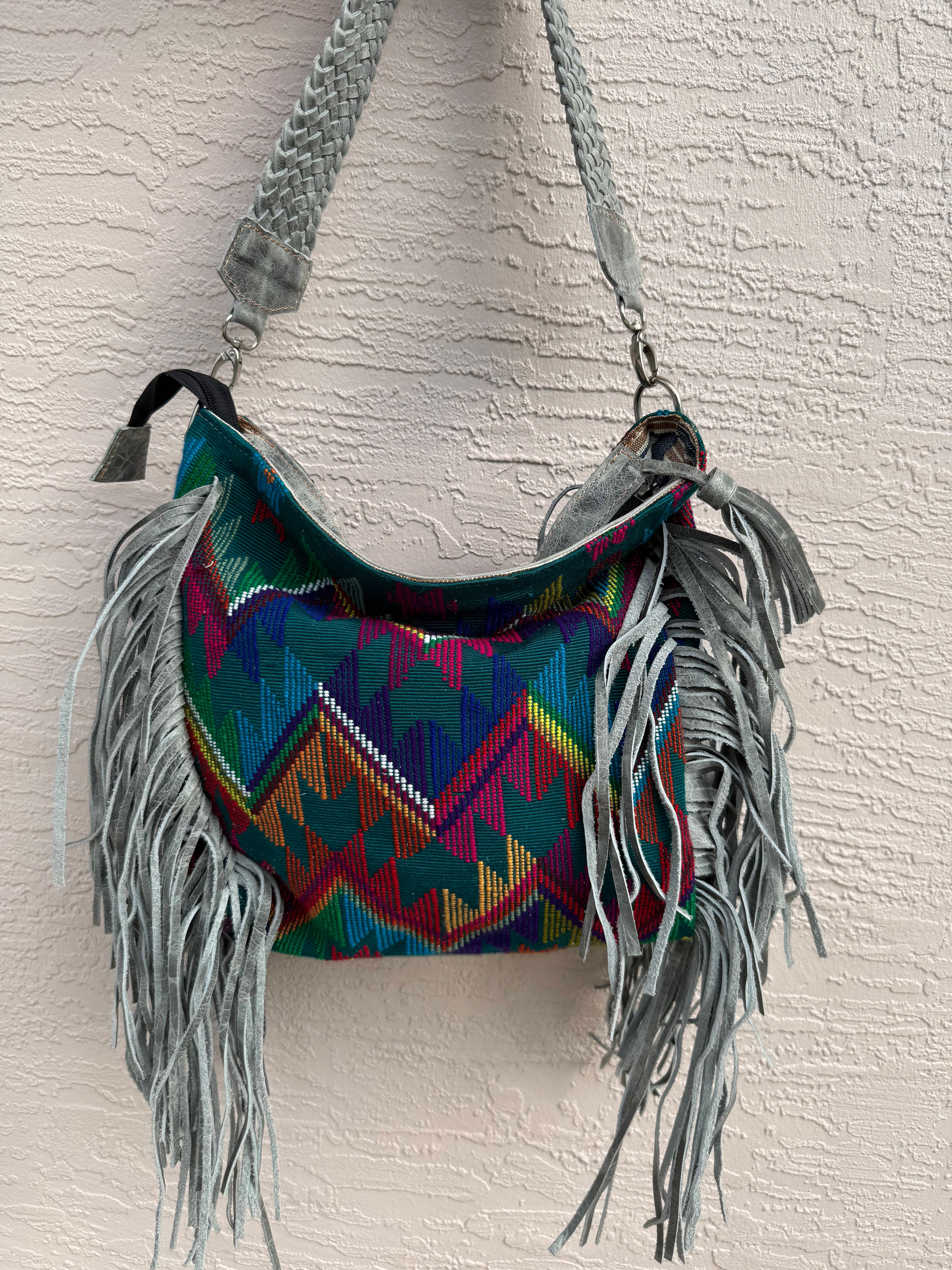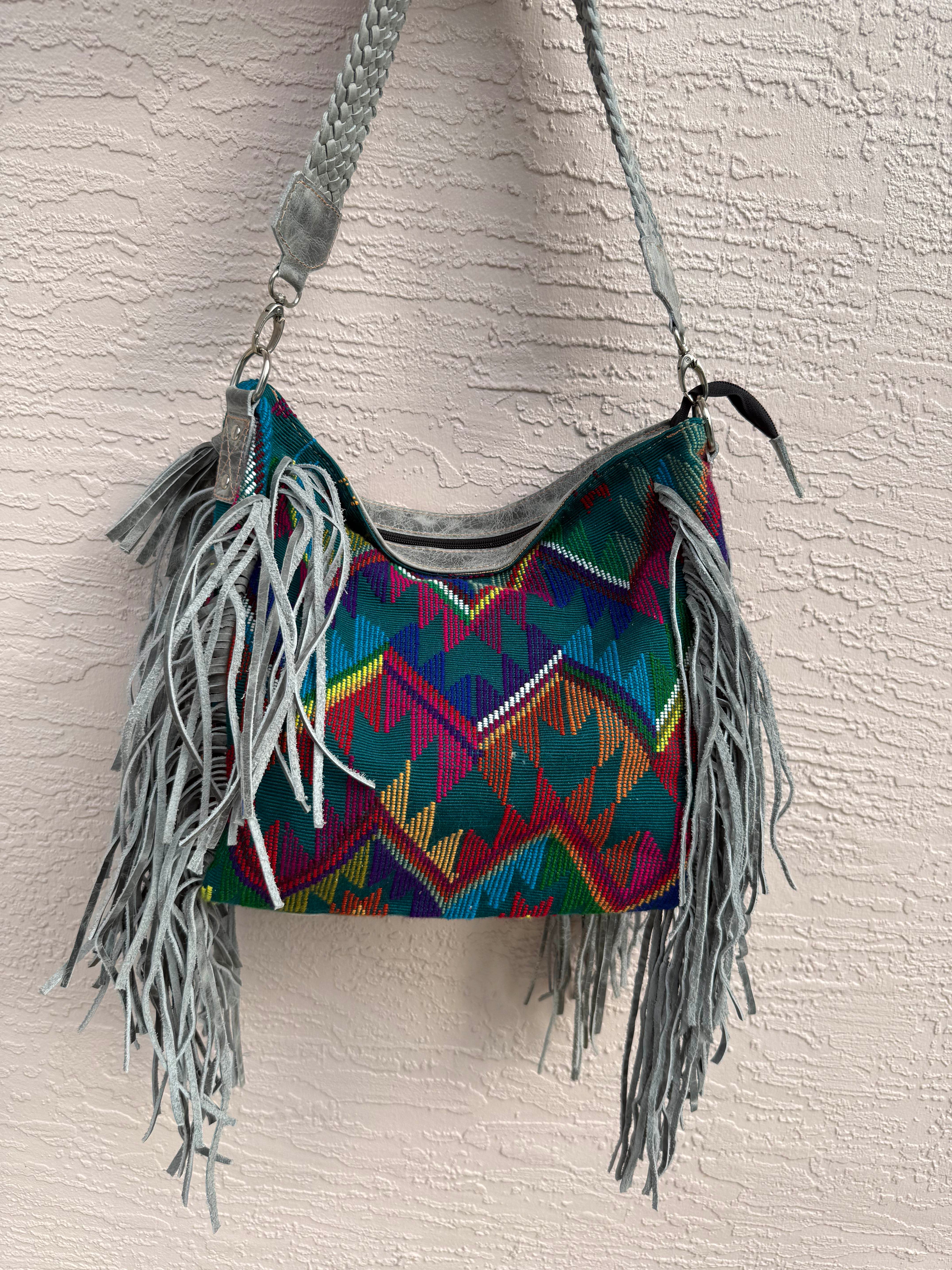 This one-of-a-kind fringe hobo shoulder bag is handcrafted in Guatemala by skilled artisans, blending bold, traditional huipil textiles with smooth leather detailing and dramatic hand-cut leather fringe. Each huipil panel is vintage and upcycled, making every bag completely unique.