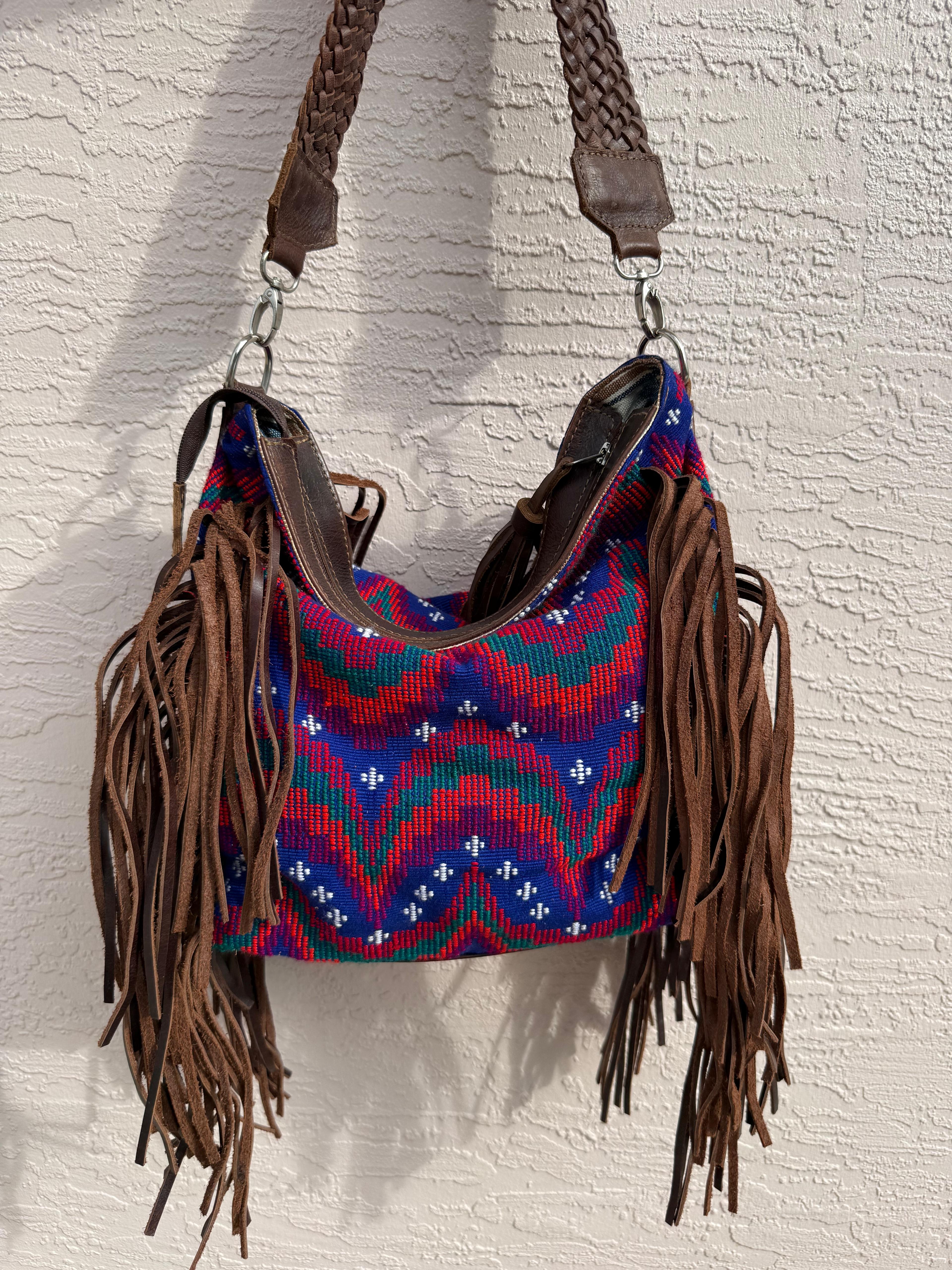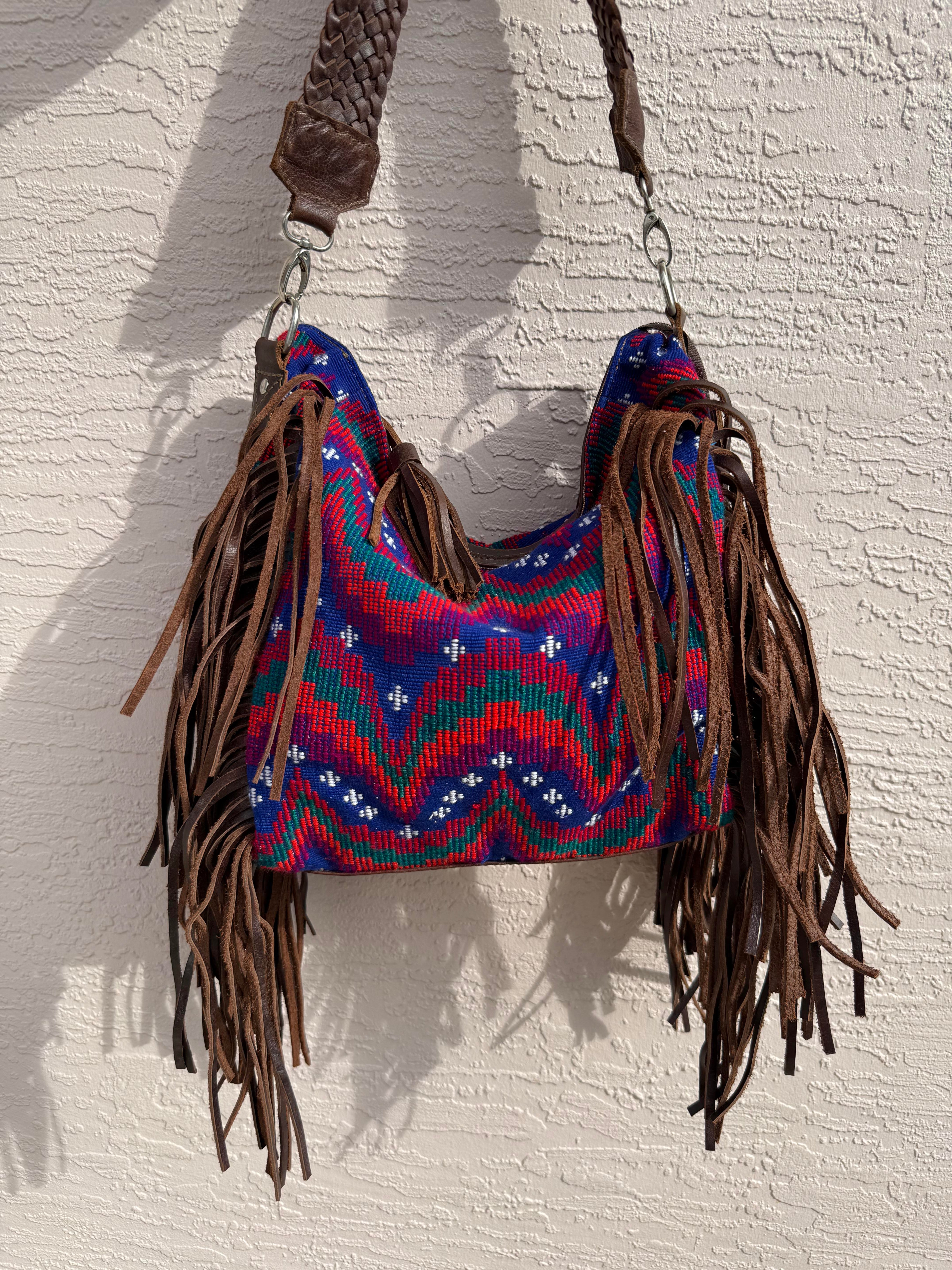 This one-of-a-kind fringe hobo shoulder bag is handcrafted in Guatemala by skilled artisans, blending bold, traditional huipil textiles with smooth leather detailing and dramatic hand-cut leather fringe. Each huipil panel is vintage and upcycled, making every bag completely unique.