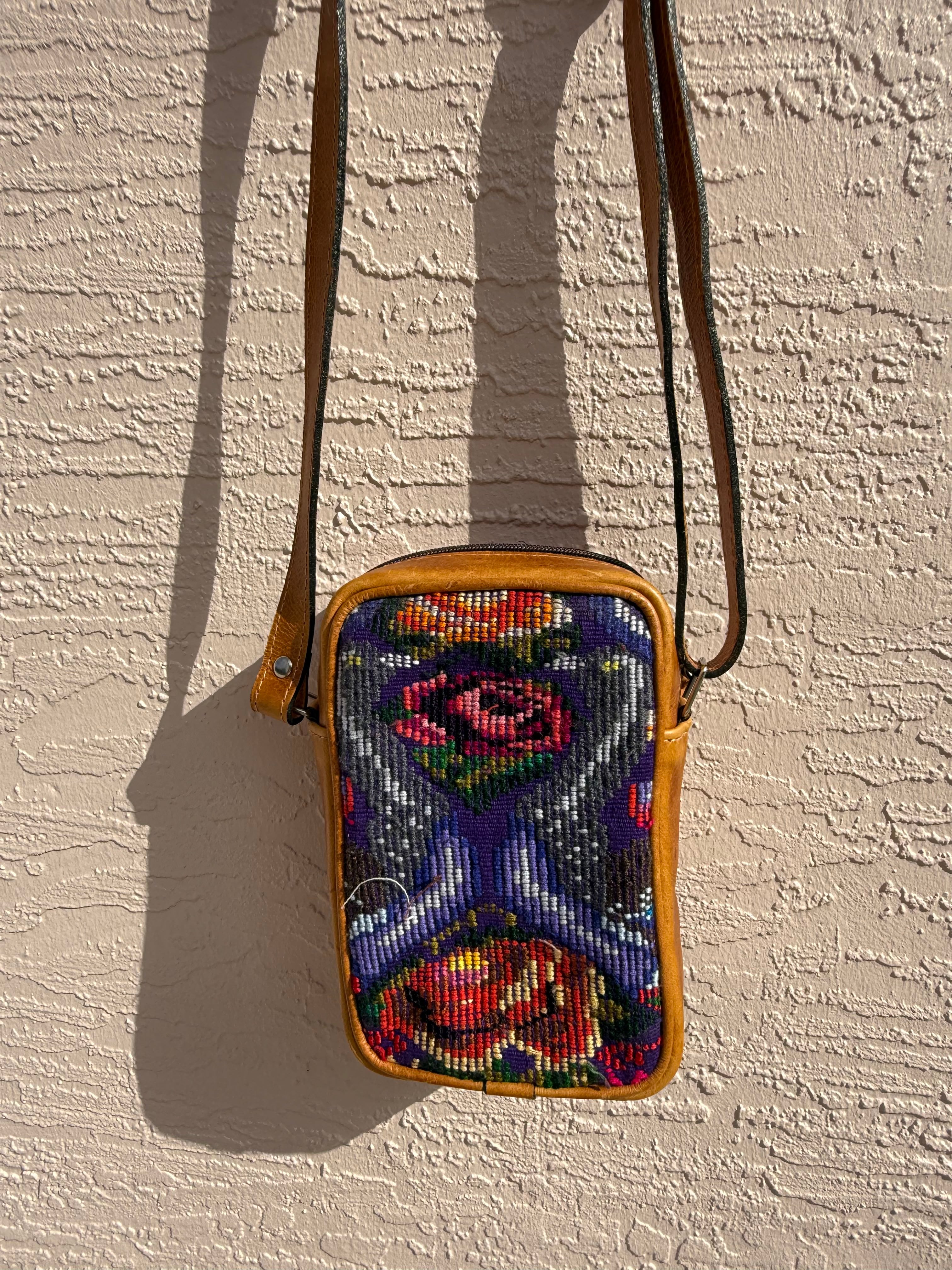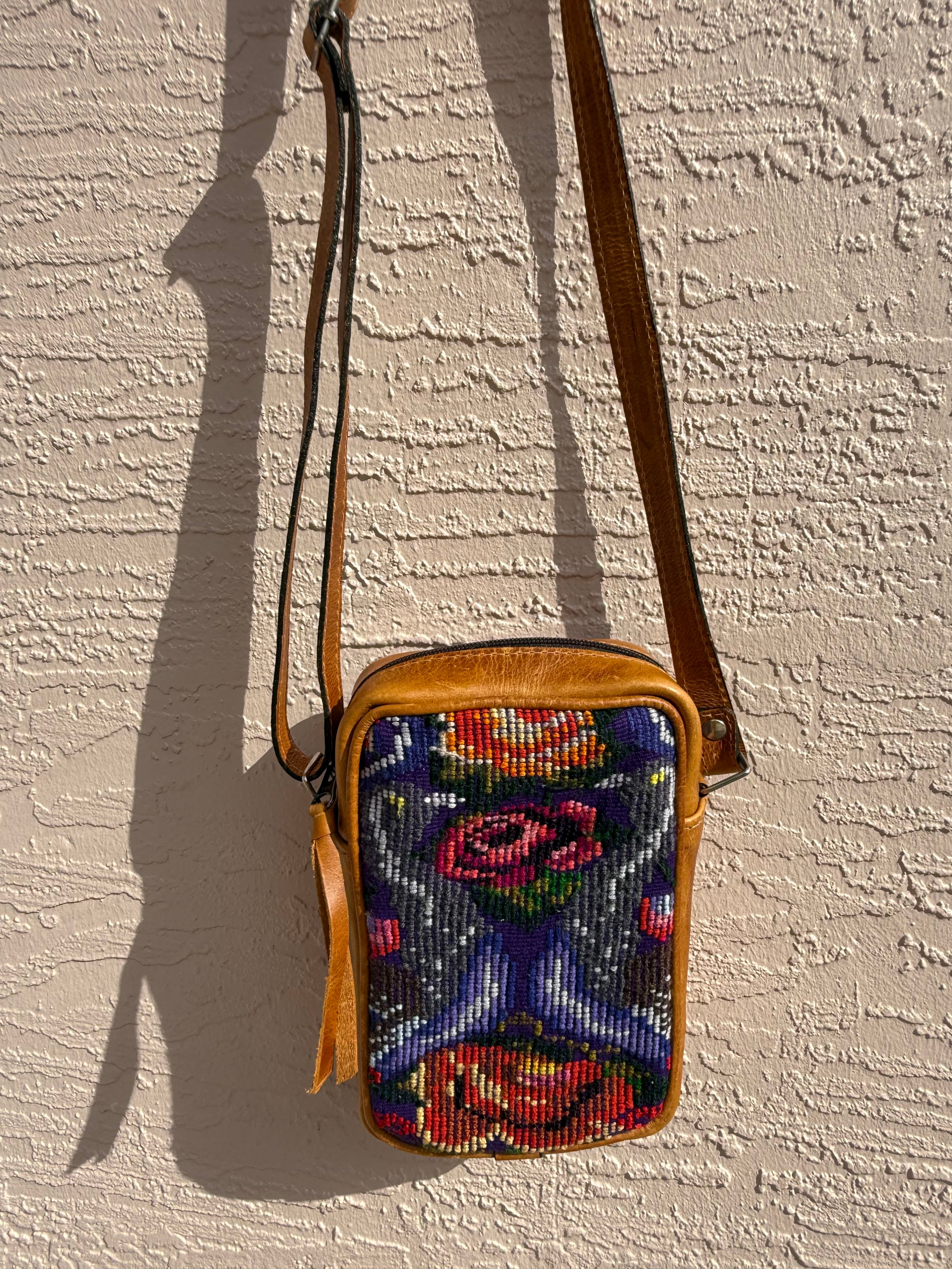 This one-of-a-kind vertical mini crossbody is handcrafted in Guatemala by skilled artisans, blending supple genuine leather with authentic upcycled huipil textiles. Each huipil panel is vintage and traditional, so no two bags are ever the same.
