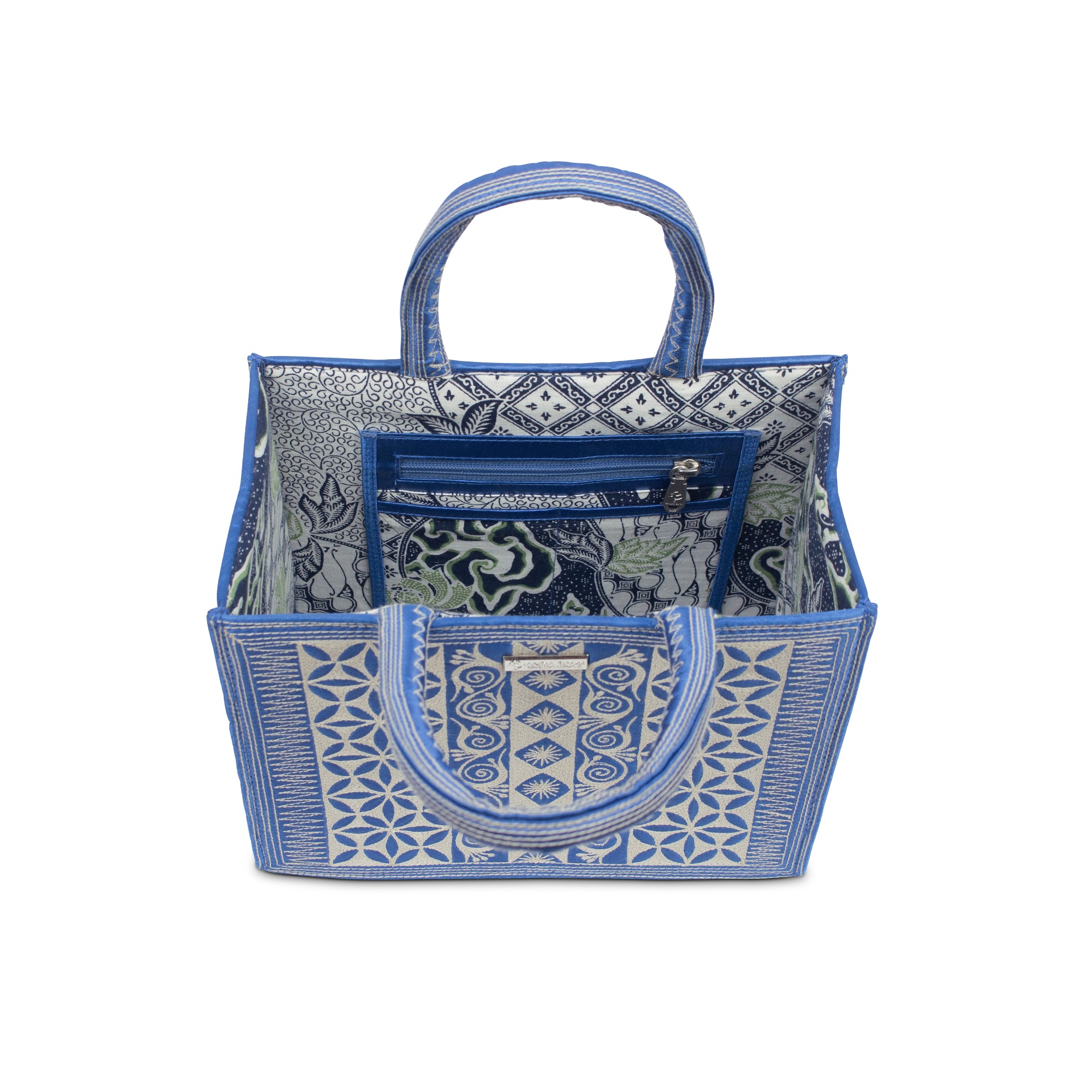 • Three pockets including one zippered in the batik-lined interior.